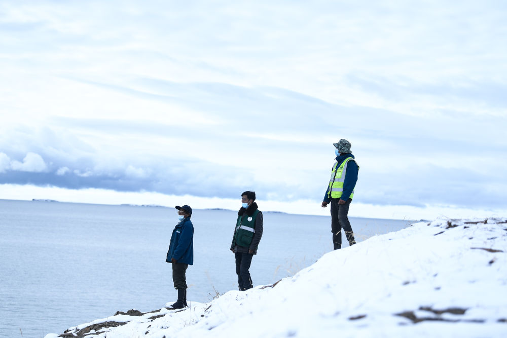 2021年10月20日,在青海省果洛藏族自治州瑪多縣扎陵湖鄉勒那村,三江源國家公園黃河源園區生態管護員在扎陵湖畔巡護。新華社記者 李占軼 攝