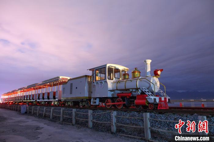 圖為夜色籠罩下茶卡鹽湖的小火車。  黃丹丹 攝