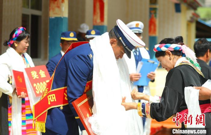 圖為村民為巴桑旺堆獻(xiàn)上哈達(dá)。 西繞拉翁 攝