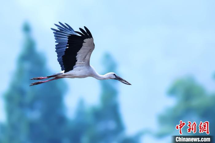飛翔的鉗嘴鸛。 周學(xué)峰 攝