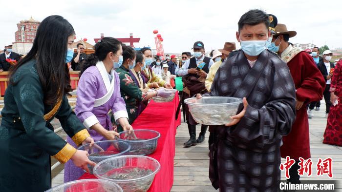 圖為民眾增殖放流青海湖裸鯉。 李雋 攝