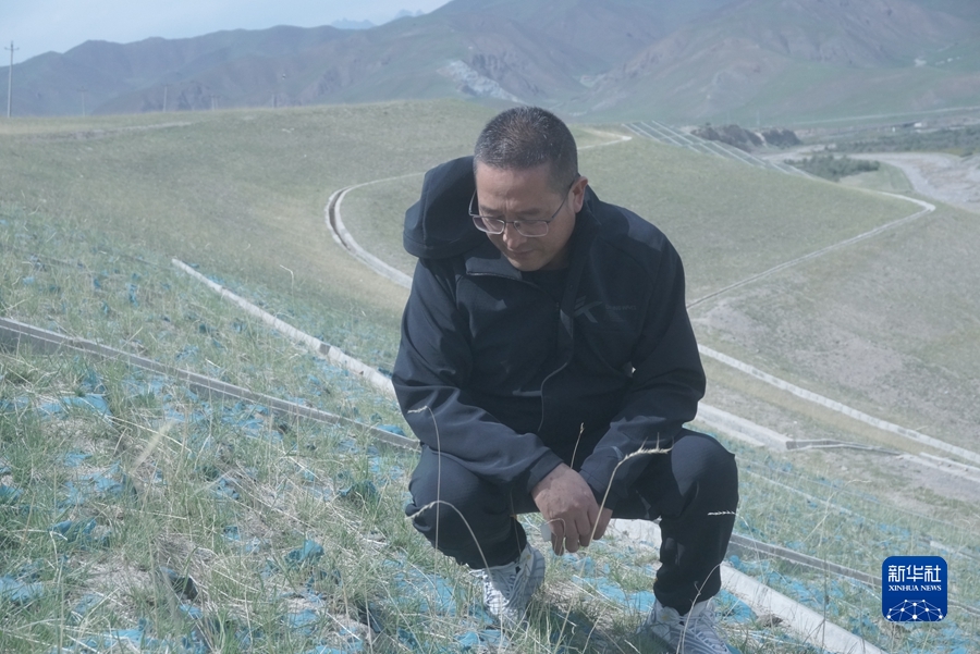 6月16日,祁連縣山水林田湖試點項目辦公室干部楊富存正在小八寶河河畔查看治理成效。新華社記者 周盛盛 攝