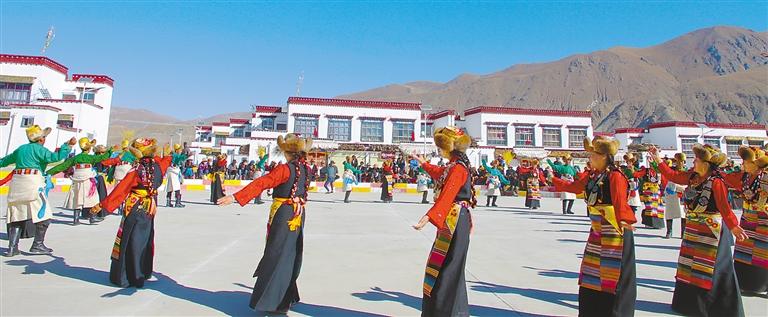 文藝事業繁榮興盛,全區共有10個專業文藝團體、76個縣區藝術團、153個民間藏戲隊、395個鄉鎮文藝演出隊,所有行政村成立群眾文藝演出隊。圖為西藏自治區扎囊縣德吉新村群眾文藝演出隊開展演出活動。