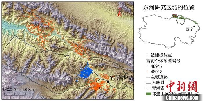 圖為“祁跡”“祁妙”活動(dòng)范圍圖,藍(lán)色為“祁跡”,紅色為“祁妙”。 中新社發(fā) 祁連山國(guó)家公園青海省管理局 供圖