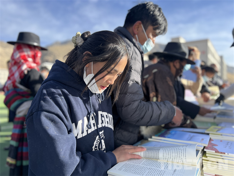 在送“書籍” 現場,《西藏文學》《西藏文藝》《邦錦梅朵》三個編輯部工作人員為現場群眾和當地干部贈送書籍,當地群眾和學生們紛紛前來翻看尋找自己喜歡的書籍,大家人手幾本書?!拔移綍r喜歡閱讀藏文文學作品,這次要了兩本文學相關書籍拿回家閱讀”17歲的益西巴珍說。據了解,此次活動西藏文聯向熱愛閱讀的群眾和學生共贈送1500本(冊)文藝書籍和期刊。