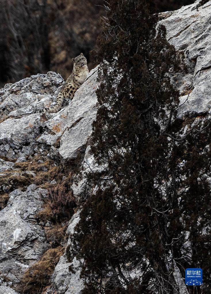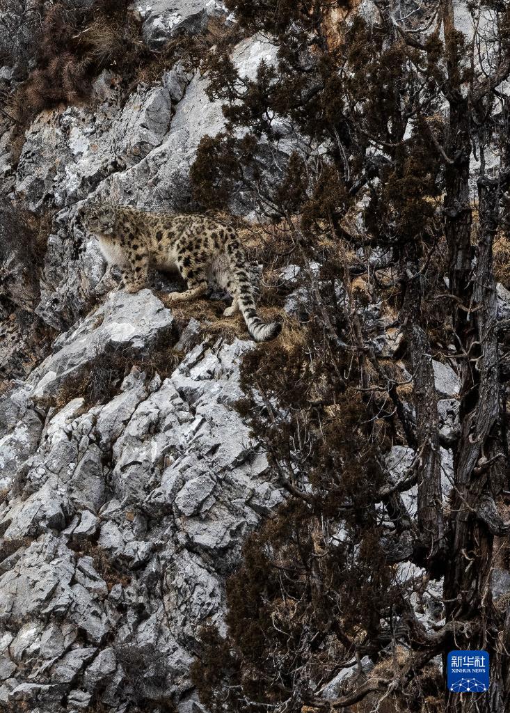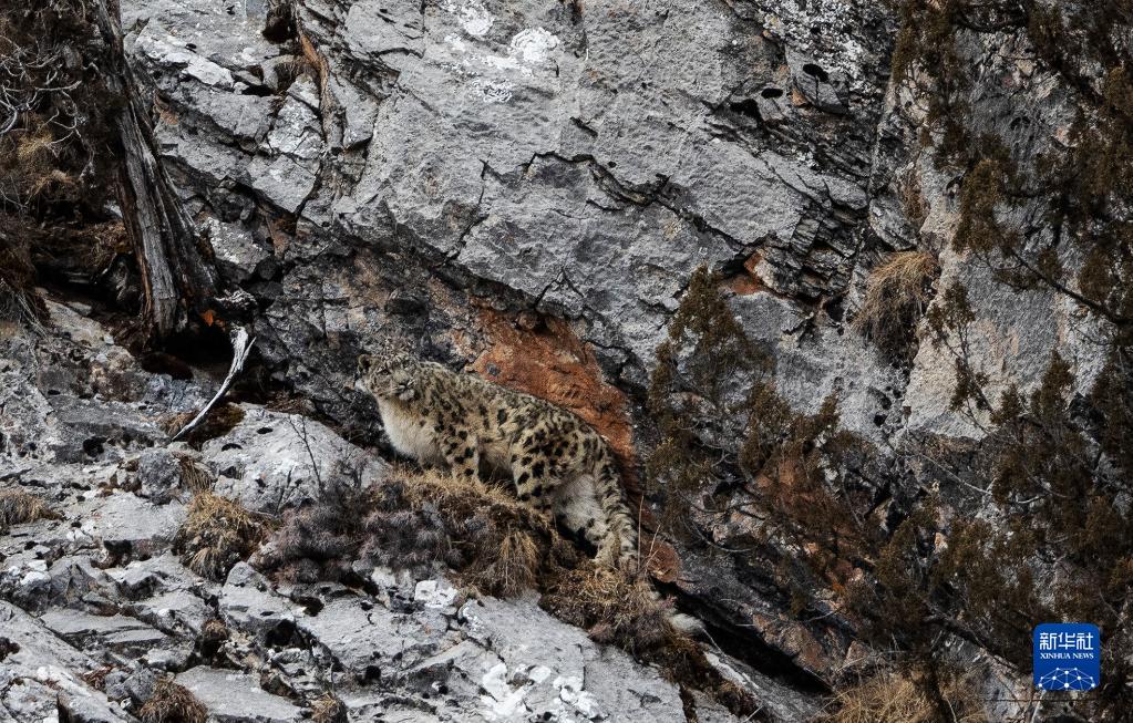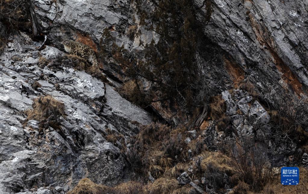 2月21日,在青海省玉樹藏族自治州雜多縣昂賽鄉境內的昂賽大峽谷內,一只雪豹正在活動。新華社記者 張宏祥 攝