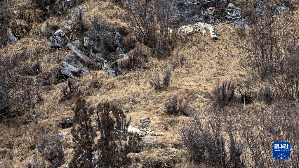 2月21日,在青海省玉樹藏族自治州雜多縣昂賽鄉境內的昂賽大峽谷內,兩只雪豹正在休息。新華社記者 張宏祥 攝