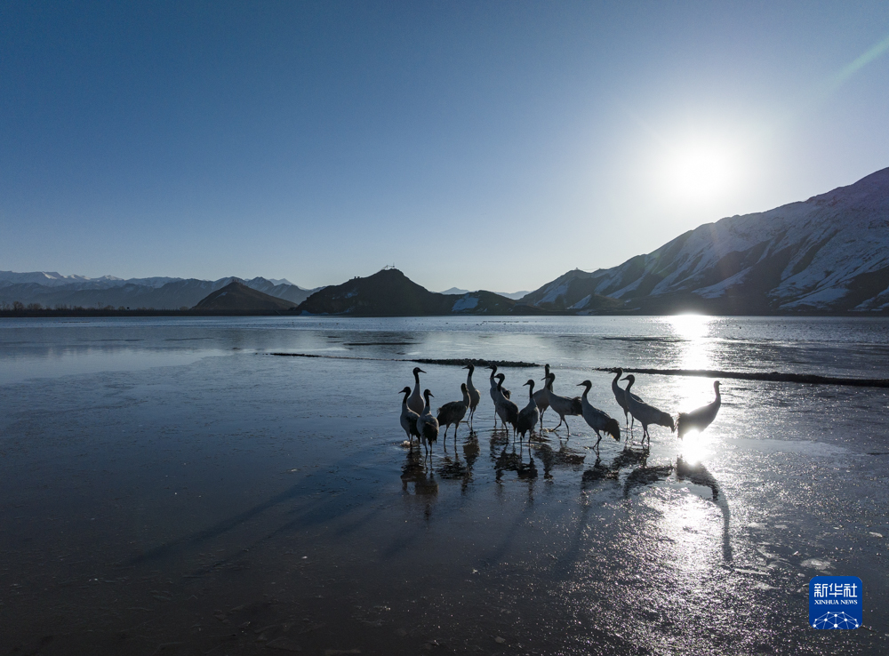 拉薩市林周縣卡孜水庫拍攝的黑頸鶴(3月1日攝,無人機(jī)照片)。新華社記者 孫非 攝