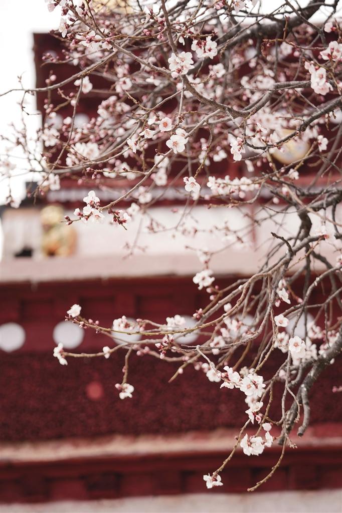 4月的帕邦喀,桃花開得正茂,桃樹枝上早已經(jīng)掛滿了大大小小的花朵,沿著石板臺階走走停停,可以看到桃樹舒展枝條,朵朵桃花爬上枝頭沐浴著春日的暖陽,在藍天白云、紅墻金頂?shù)挠骋r之下格外美麗,構(gòu)成一幅絕妙的春景詩畫。偶爾枝頭傳來清脆的鳥鳴聲,讓這里顯得愈發(fā)靜謐美好。