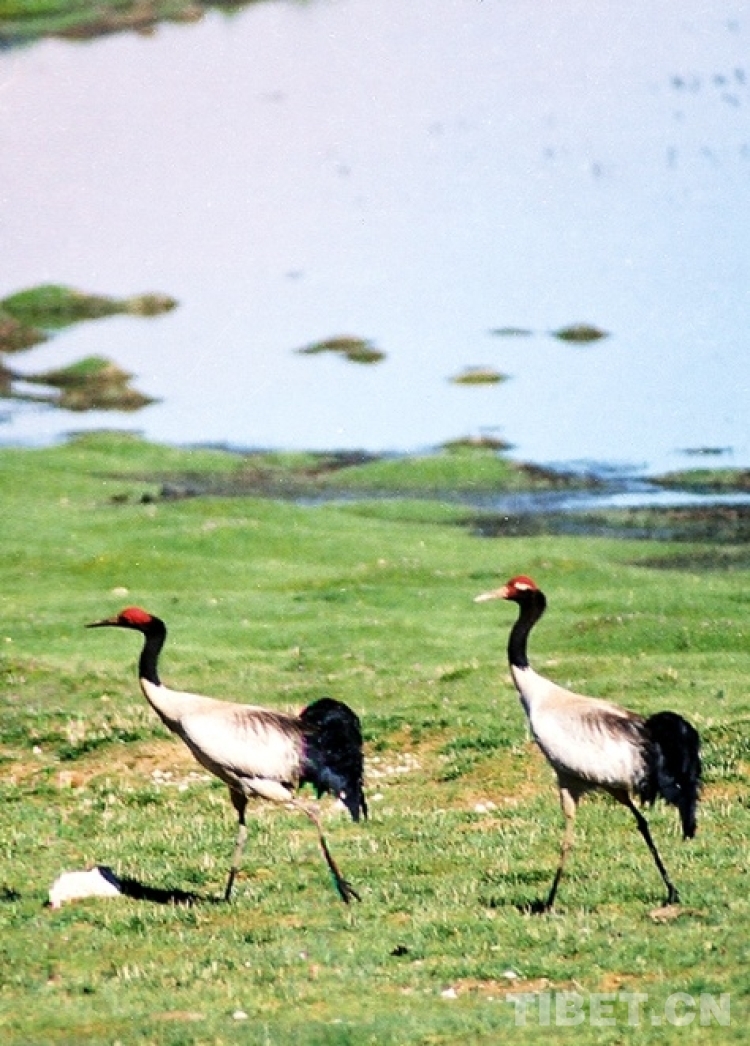 這是兩只漫步在藏北色林錯(cuò)國(guó)家級(jí)自然保護(hù)區(qū)的國(guó)家一級(jí)保護(hù)動(dòng)物、被稱為“鳥類熊貓”的黑頸鶴(唐召明2001年攝)