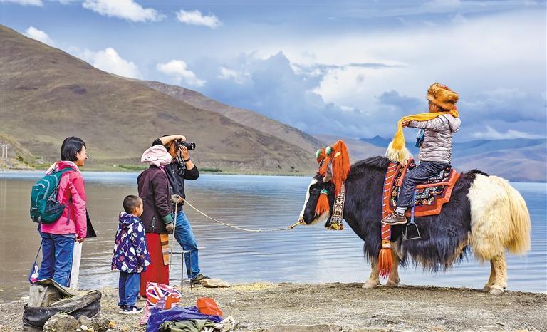 圖為游客在浪卡子縣扎瑪龍村羊卓雍錯湖畔“打卡”。記者 劉楓 攝