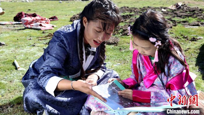 圖為青少年在納木錯湖畔的牧區共同閱讀《牛糞們的愿望》。拉薩市圖書館供圖