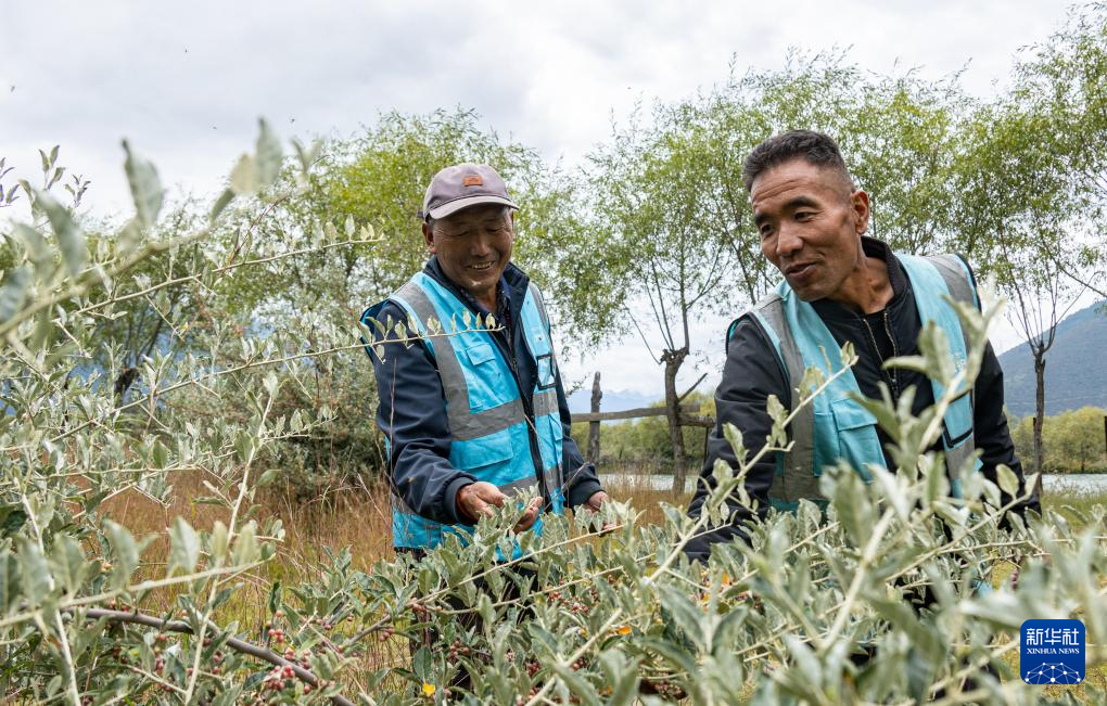 雅尼國家濕地公園管護員普布多杰(右)和同事在巡護途中查看樹木長勢(9月8日攝)。新華社發(丁增尼達 攝)