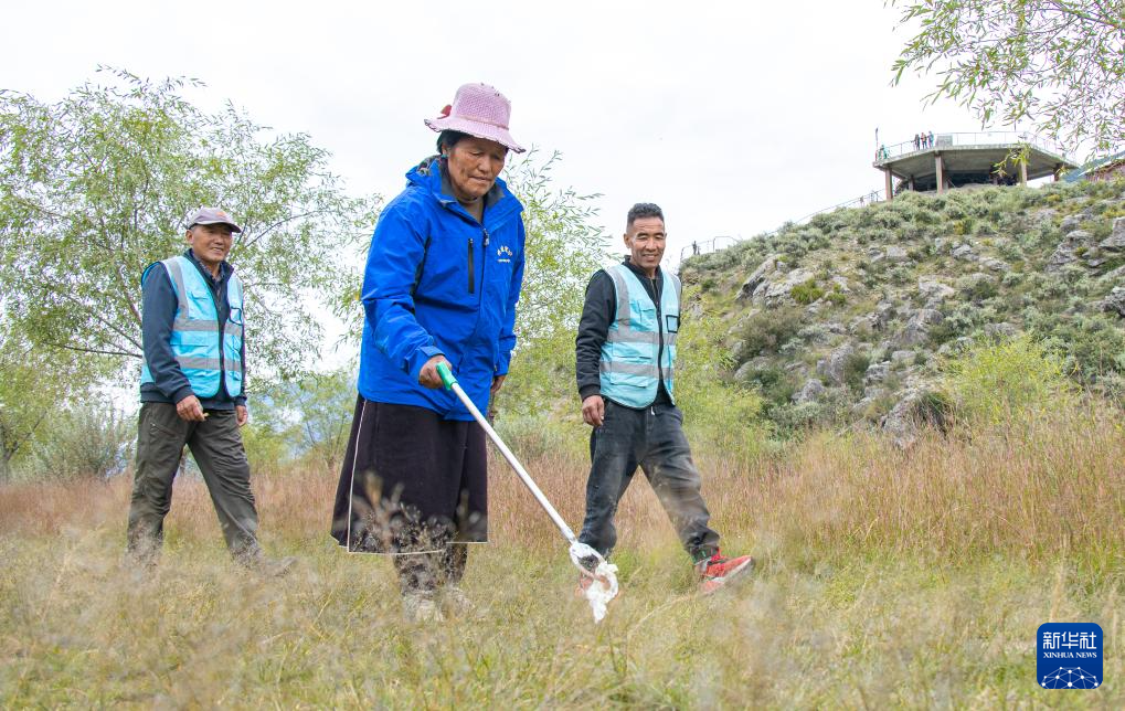 雅尼國家濕地公園管護員普布多杰(左)在巡護途中清理垃圾(9月8日攝)。新華社發(丁增尼達 攝)