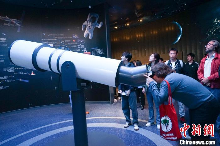 圖為一位外國(guó)政黨代表在青海省自然資源博物館內(nèi)體驗(yàn)用VR技術(shù)呈現(xiàn)的天文望遠(yuǎn)鏡。馬銘言 攝