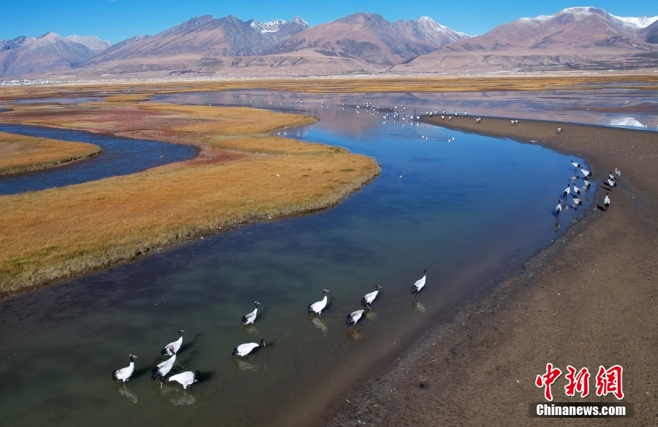 10月23日,成群的黑頸鶴在拉薩市當(dāng)雄縣阿熱濕地內(nèi)覓食。黑頸鶴是全球十五種鶴類(lèi)中,唯一在高原地區(qū)繁殖和越冬的鶴類(lèi),屬中國(guó)國(guó)家一級(jí)保護(hù)野生動(dòng)物。