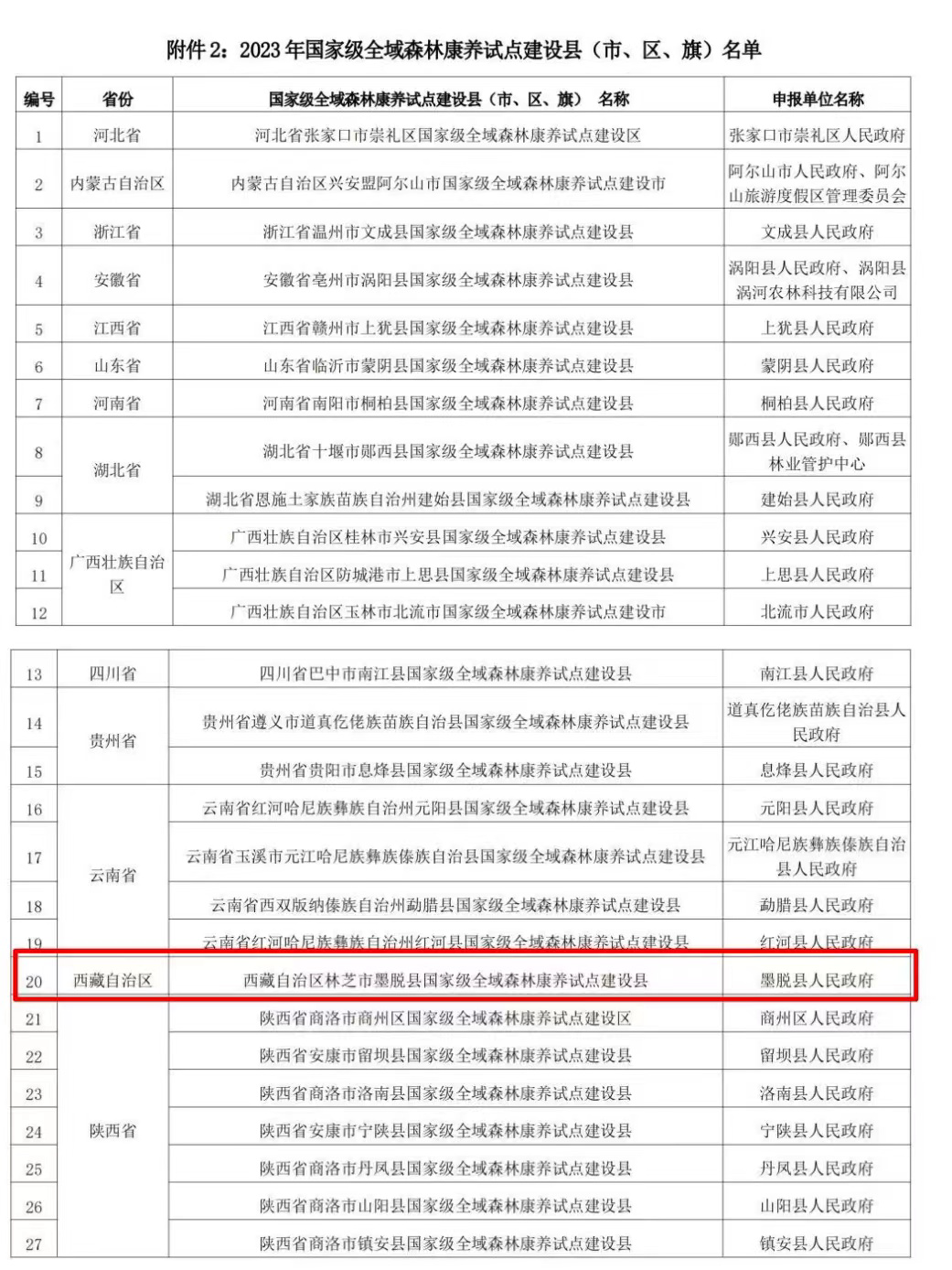 西藏唯一!墨脫縣入選2023年國家級全域森林康養試點建設縣