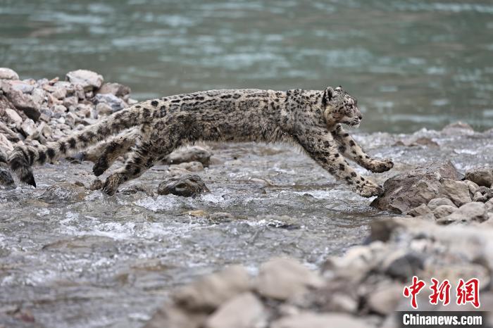 圖為三江源國家公園瀾滄江源園區拍攝的雪豹躍過河流。(資料圖)索南旦增攝