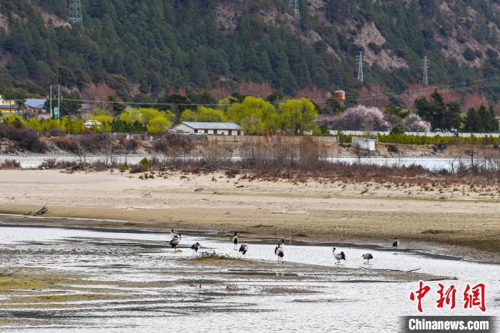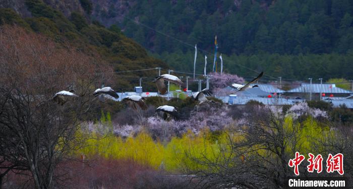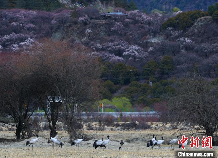 西藏林芝:黑頸鶴與雪山桃花共繪生態畫卷