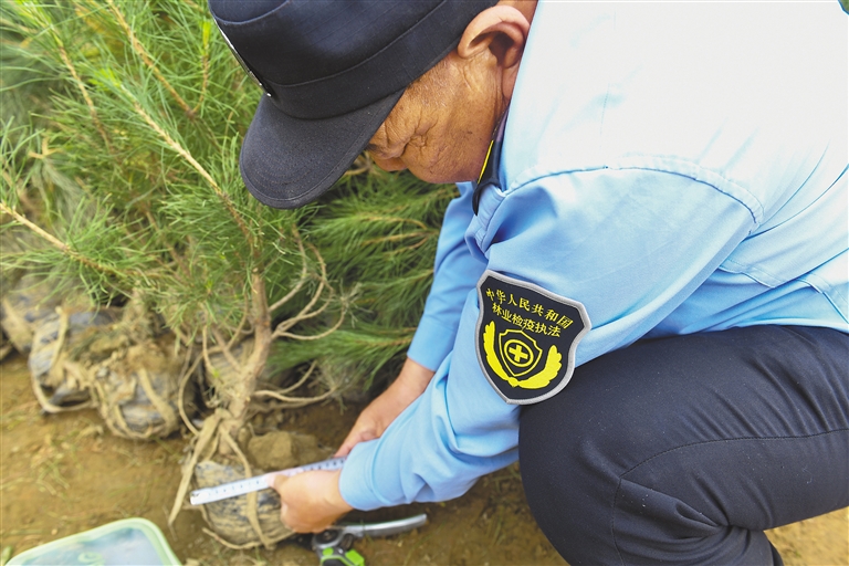 在拉薩南北山綠化工程2024年度鞏固提升(貢嘎機場周邊山體)工程項目上,林業檢疫執法工作人員在檢查樹苗根部土球是否達標。新華社記者 晉美多吉 攝