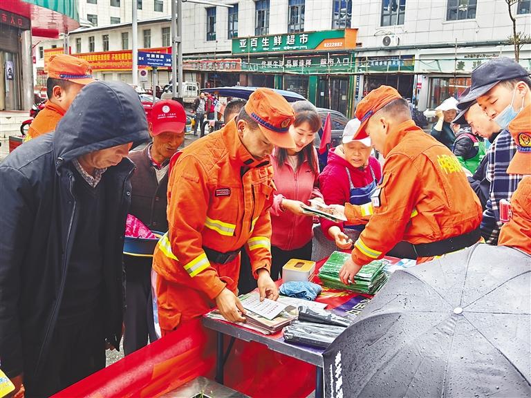 消防員發放防災減災知識手冊。記者 王雨霏 攝