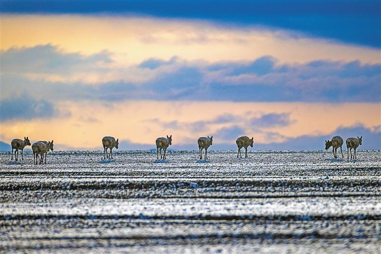 6月13日傍晚,在羌塘國(guó)家級(jí)自然保護(hù)區(qū),一群藏羚羊在遷徙。新華社記者 費(fèi)茂華 攝