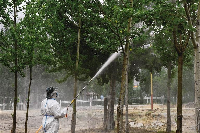 病因找到了,如何對癥下藥才是關鍵。防治隊將整片楊樹林分成三個區域,首先伐掉干死腐爛的樹,其次對病害區域進行殺菌消毒。“每個區域我們噴灑的藥劑也不同,主要是想對防治效果進行實驗。通過持續兩個月的觀察,發現第一組藥劑防治效果明顯,因此我們開始在整片楊樹林推廣第一組藥劑?!秉S敏說。