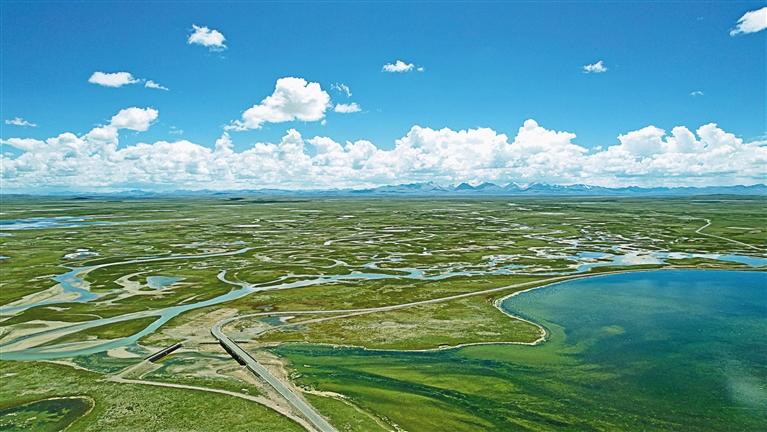 圖為三江源國家公園唐北區域聶榮片區尼日阿錯改湖濕地鳥瞰圖。記者 萬靖 攝