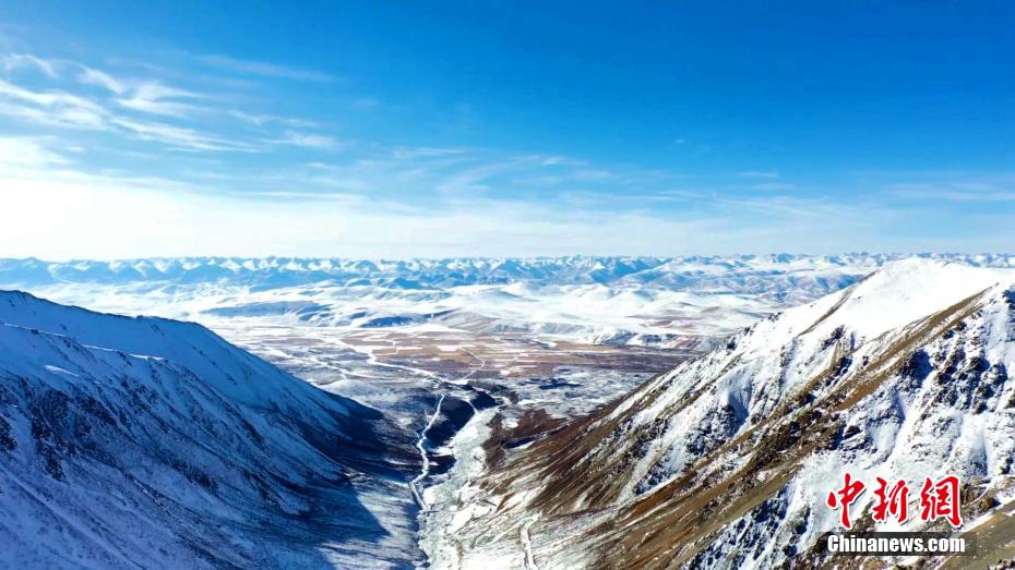 時值初冬,青藏高原已是一幅深冬景象。位于祁連山腹地的青海省海北藏族自治州門源縣境內,大地被大雪覆蓋,干凈如初,浩門河蜿蜒著穿境而過。祁連山脈東段最高峰崗什卡雪峰和七彩瀑布宛若大自然雕琢的藝術品,在陽光的照耀下閃爍著光芒。圖為祁連山腹地被冬日暖陽照射。