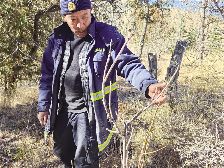 目前,南山公園的樹種特別多,有油松、竹子、桃樹、楊樹、杏樹等?!扒锾斓絹砗?,樹上有野山桃、山杏等果實,我有時會摘一些成熟的水果吃。”扎西曲培說,“南山公園就像自己的孩子,看著它一點點長大。時間越久,我對南山公園的感情越深?!?/p>