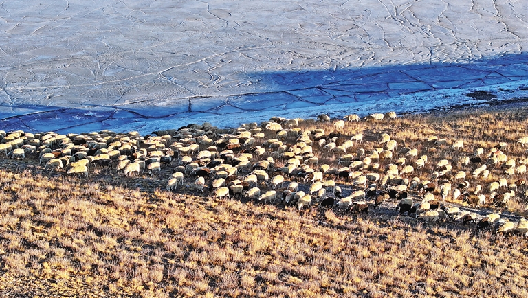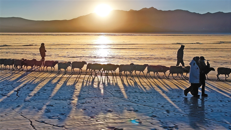 朝陽(yáng)下,羊群在牧民和民警的保護(hù)下前往湖心島牧場(chǎng)。(圖片均由記者 旦增蘭澤 平措次仁 晉巴次成 武沛濤 攝)