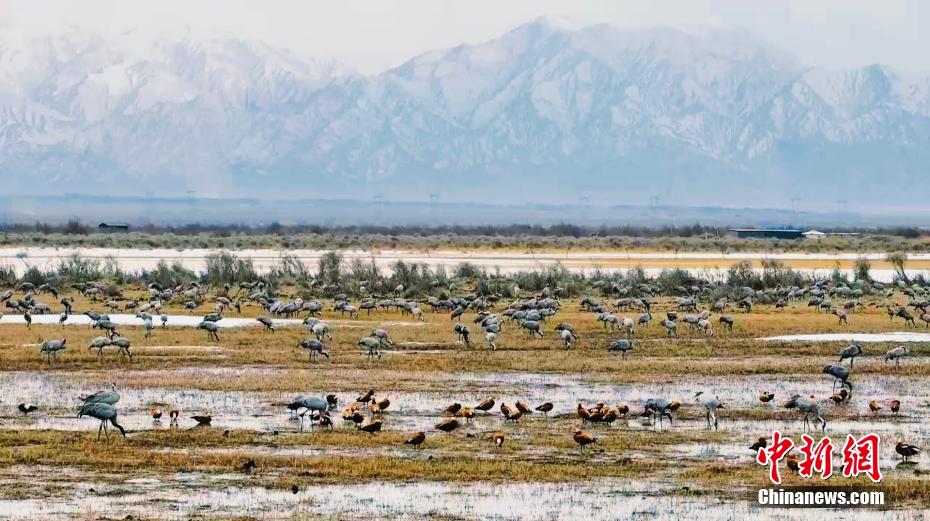連日來(lái),成群灰鶴聚集于青海省海西蒙古族藏族自治州都蘭縣巴隆鄉(xiāng)鐵絲蓋地區(qū)。灰鶴是國(guó)家二級(jí)重點(diǎn)保護(hù)野生動(dòng)物。圖為灰鶴等野生鳥(niǎo)類(lèi)群在濕地休憩。
