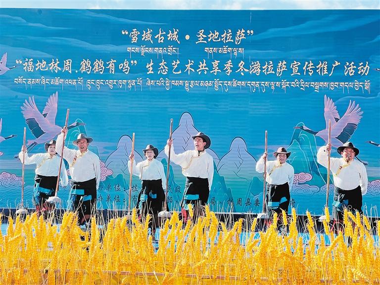 當溫暖的陽光輕柔地灑在拉薩河谷,黑頸鶴清脆的鳴叫聲喚醒了林周濕地寧靜的清晨。“福地林周·鶴鶴有鳴”生態(tài)藝術(shù)共享季之“冬游拉薩”宣傳推廣活動,以歌舞表演、生態(tài)主旨演講、黑頸鶴攝影作品展、鶴文化專家座談等,融合了生態(tài)、藝術(shù)與文化的盛宴,讓人在雪山、湖泊與鶴影交織的詩意中,感受“冬游拉薩”的獨特魅力。