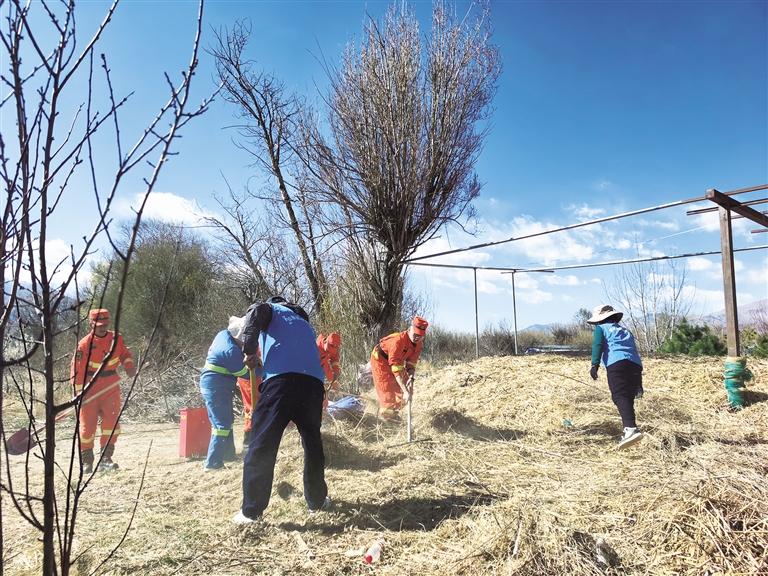 西藏森林消防總隊特勤大隊和濕地巡護人員清理可燃物。記者 王靜 攝
