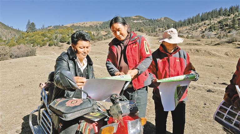 貢覺縣則巴鄉衛通村的護林員向上山放牧的牧民宣傳護林防火知識。記者 貢秋曲措 通訊員 董燕 西繞丹青 攝