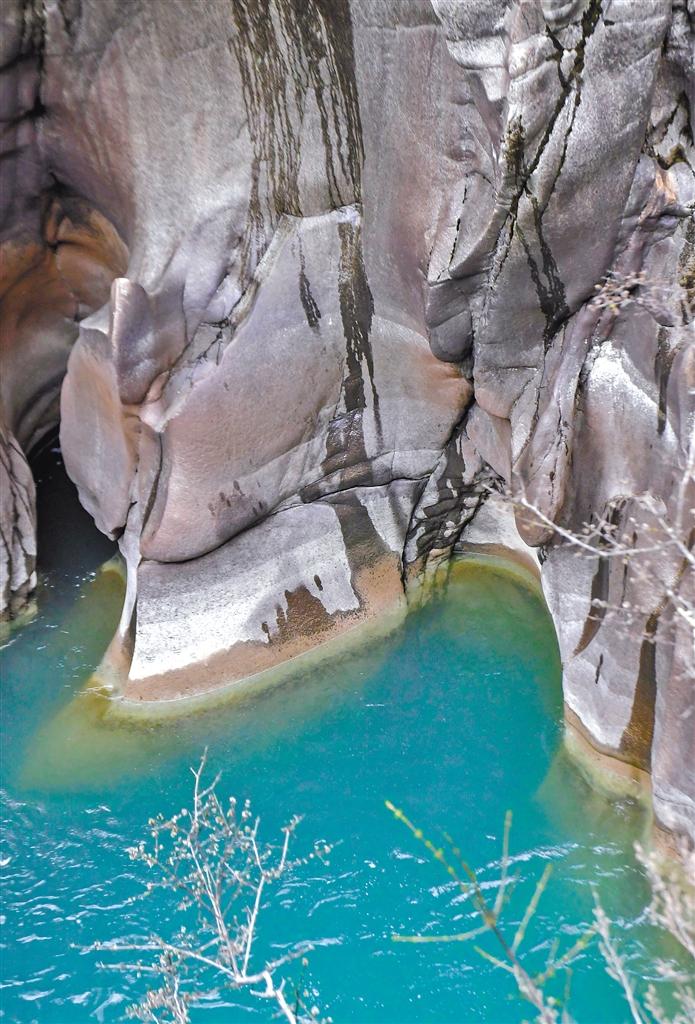 在丙察察公路接近察隅縣城的位置,國道219線與559線交匯點,有一處由水流反復沖刷激蕩出的地質奇觀——水磨巖。