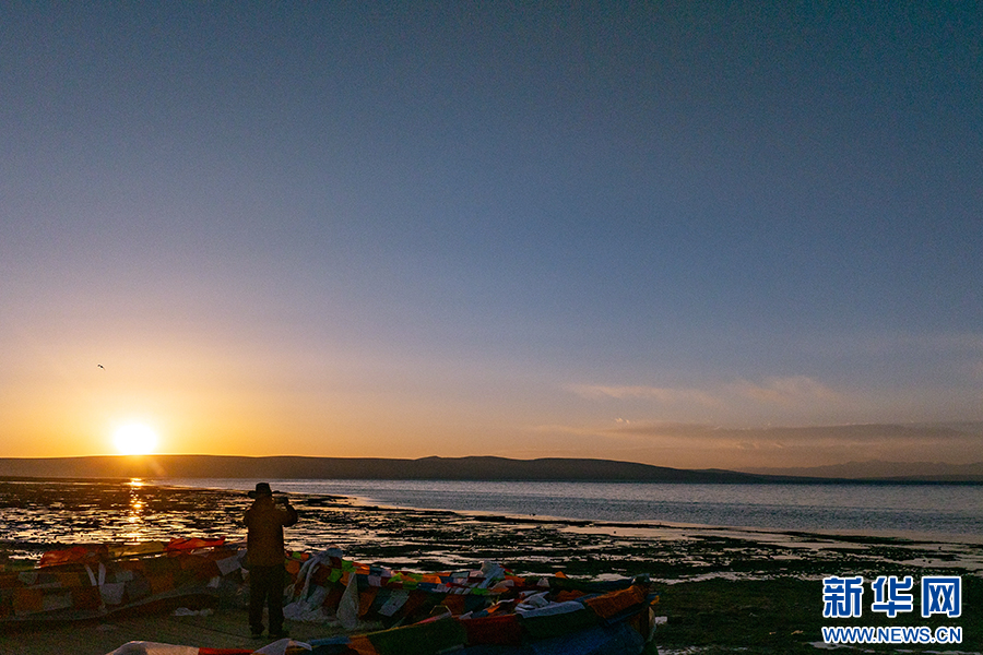 夕陽下,游客在瑪旁雍錯邊游玩。(6月9日攝)。新華網 旦增努布 攝