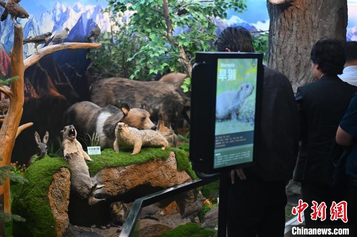 6月16日,在位于甘肅省張掖市肅南裕固族自治縣的祁連山國家公園自然博物館內,游人參觀喜馬拉雅旱獺標本。中新社記者 李亞龍 攝