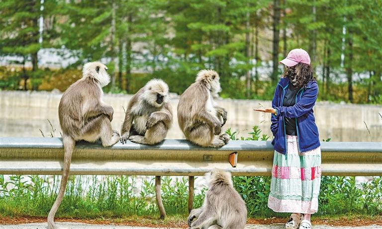 圖為6月20日,在亞東縣一條公路邊,游客在和長尾葉猴互動(dòng)。新華社記者 丁增尼達(dá) 攝