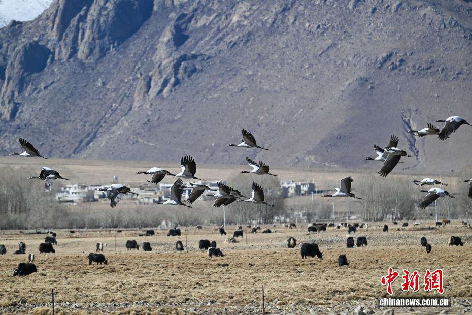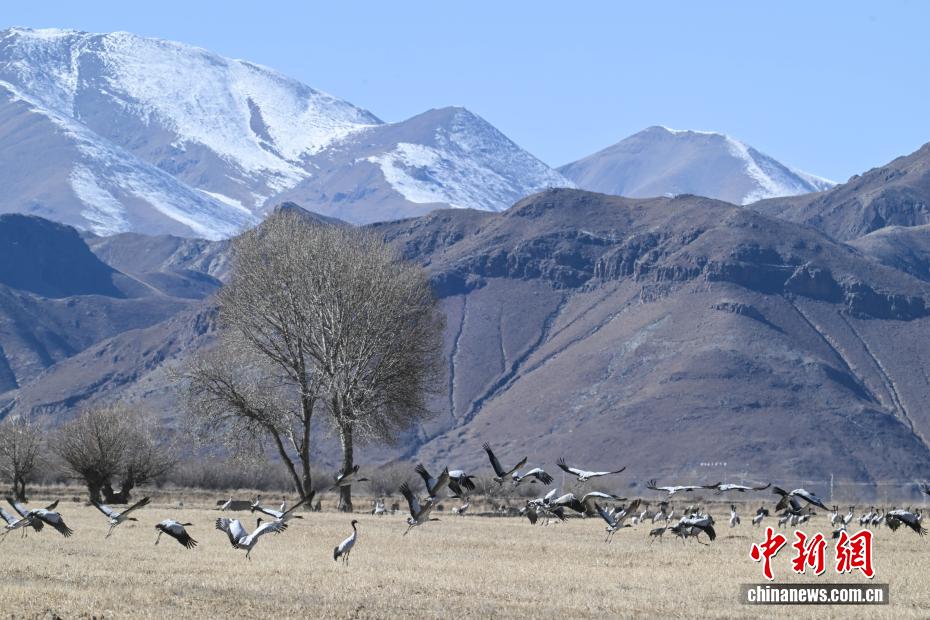 11月26日,位于西藏自治區拉薩市林周縣的黑頸鶴自然保護區內,大量越冬的黑頸鶴在卡孜水庫、農田、濕地里覓食、嬉戲。林周縣位于拉薩河上游及澎波河流域,是黑頸鶴的主要越冬地之一。中新社記者 貢嘎來松 攝