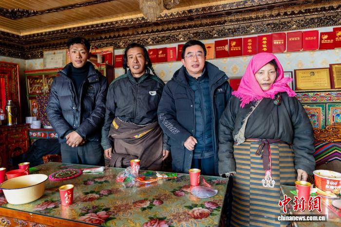2025年12月21日,連玉明(右二)走進海拔5300米的長江源頭牧民家中調研,并與牧民一家合影。受訪者供圖