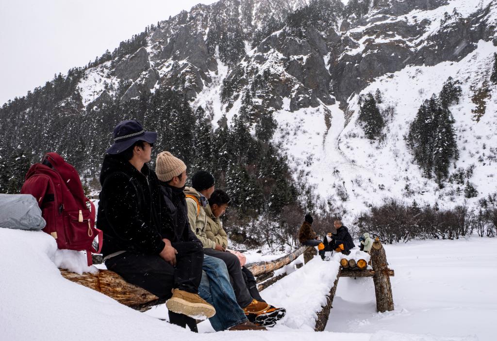 游客們一路走走停停,拍照、駐足、感嘆。因風(fēng)雪較大,到牧場(chǎng)的2公里路就走了整整一小時(shí)。但沒有人放棄,也沒有人覺得遺憾——白普隆溝的美,不在于抵達(dá)終點(diǎn),而在于每一步都有驚喜。