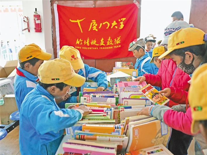 圖為廈門大學(xué)竹蜻蜓支教隊在當(dāng)雄縣龍仁鄉(xiāng)中心小學(xué)舉辦流動圖書館活動。通訊員 黃宇霞 高捷 何春雨 崔慶煒
