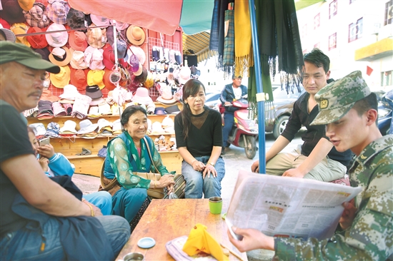 圖為拉薩警備區某團官兵為社區居民宣講政策。通訊員 涂君陽攝