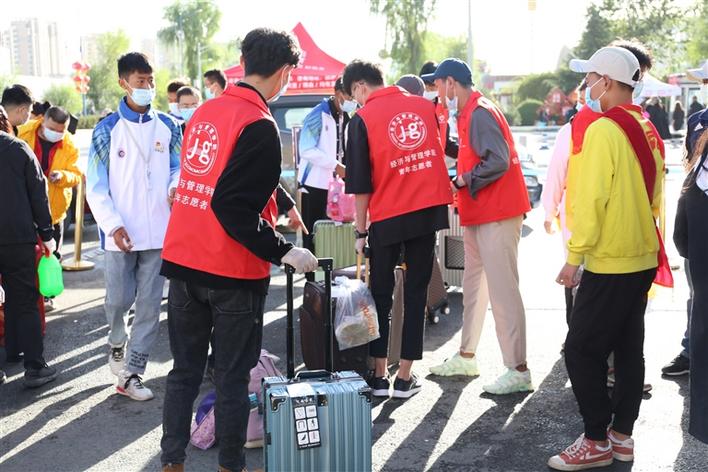 在西藏大學各學院的服務點前,新生在志愿者的幫助下進行口罩替換、行李消毒、體溫測量、入校審批表核驗等工作,核驗無誤后,由志愿者幫忙運送行李前往宿舍樓。
