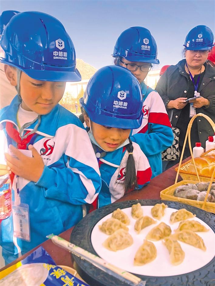 拉薩市第三小學學生觀看青稞制成的餃子。