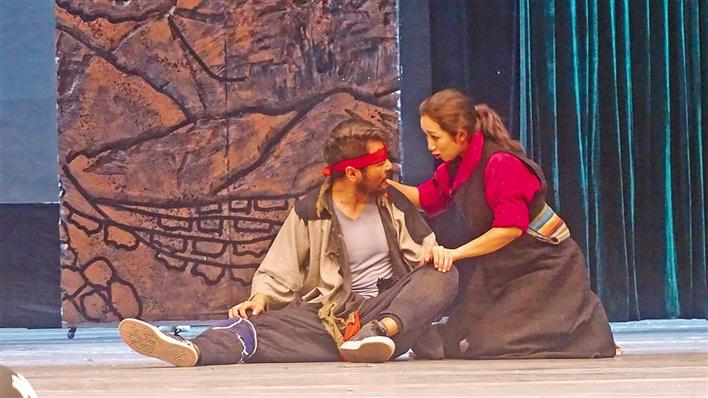 洛丹告訴記者,正如時代的發展,該劇也在自我完善中不斷前行。第四次復排時,該劇運用了360度旋轉舞臺,滿足各種場景的切換需求,并運用投影對舞臺效果進行補充。同時,對演員們的服裝和舞美等方面也進行了精心設計。“道具的設計更值得一提,很多道具相比之前都發生了微妙變化。比如,強巴送給女主的定情信物,不再是之前的一枚銅戒指,而是一顆閃閃發亮的五角星。”