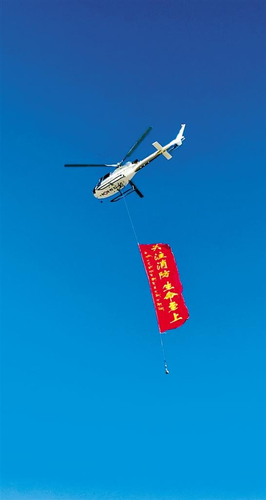 直升機攜帶”關注消防 生命至上“的標語開展空中宣傳。