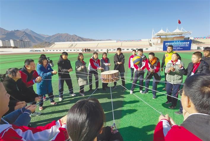 圖為西藏自治區(qū)“體育項(xiàng)目進(jìn)校園”拉薩北京中學(xué)站活動中,學(xué)生在參加“齊心筆”拓展訓(xùn)練。 記者 潘璐 攝