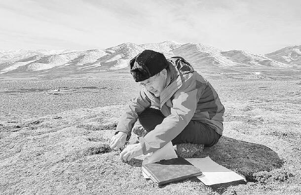 趙新全在青海省海南藏族自治州貴德縣采集牧草樣品(2020年2月29日手機拍攝)。新華社發